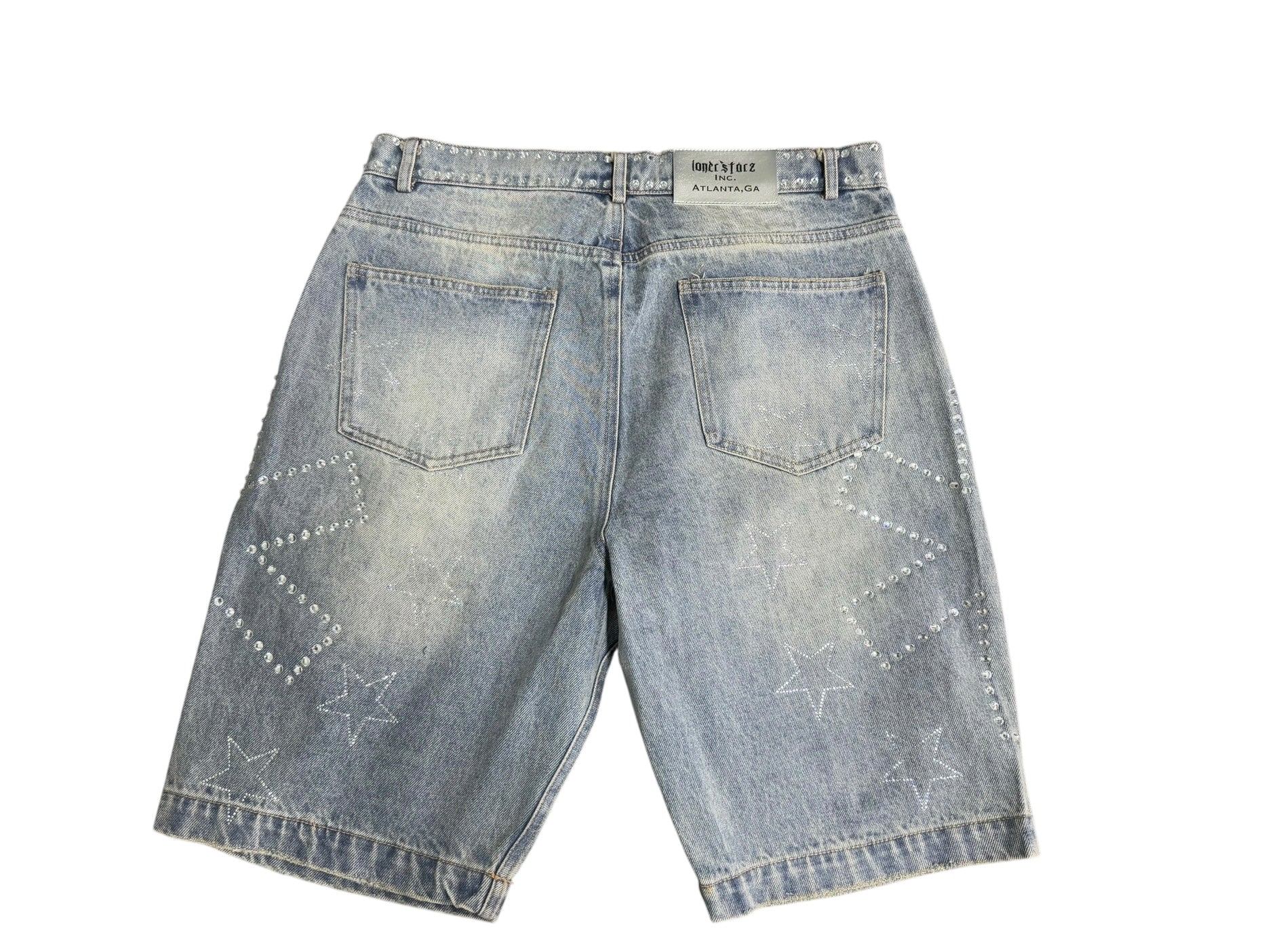 Crafted from premium cotton denim, these Sirius cutoff Jorts feature hot-fix logo customization that includes a shiny silver unique leather patch and reinforced hot-fix pattern going through out the loops as well as hidden rivets and belt line. They're designed for a relaxed fit in a light stone wash with hot-fix pearls studded throughout.